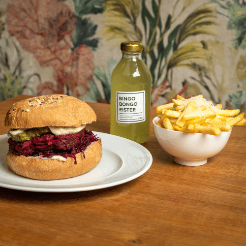 Serviert mit einem Vegi Bingo Bongo Rooftop Burger, Berner-Fries mit Parmigiano Reggiano oder einem Menüsalat und einem hausgemachten Grüntee-Limetten Eistee